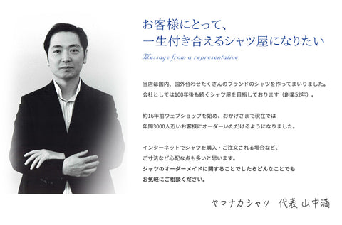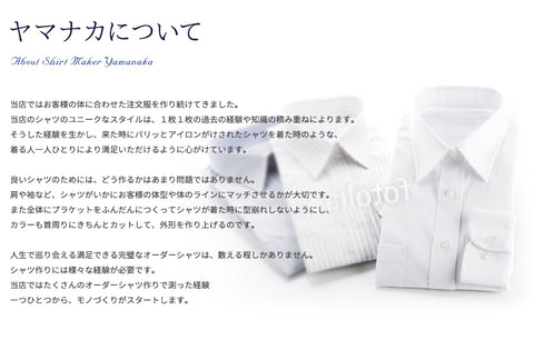 千葉県市川市の創業1964年のフルオーダーシャツ工房です。 シャツは全て自社工房で少数精鋭の職人達が一日約10~15枚のオーダーシャツを作っています。